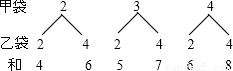 将5个完全相同的小球分装在甲、乙两个不透明的口袋中.甲袋中有3个球,分别标有数字2,3,4;乙袋中有2个球,分别标有数字2,4.从甲、乙两个口袋中各随机摸出一个球.