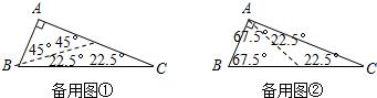 已知△ABC中,∠A=90°,∠B=67.5°,请画一条直线,把这个三角形分割成两个等腰三角形.(请你选用下面给出的备用图,用两种不同的分割方法画出来.只需画图,不必说明理由,但要在图中标出相等两角的度数)