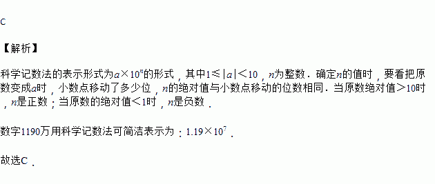 安徽电网近年来新能源装机发展迅速,截止2018年3月,全省新能源总装机达1190万千瓦,那么1190万用科学记数法可表示为
