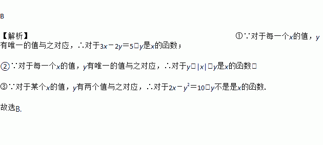 下列关于变量x,y的关系式中:①3x-2y=5;②y=|x|;③2x-y2=10.其中y是x的函数的是( )