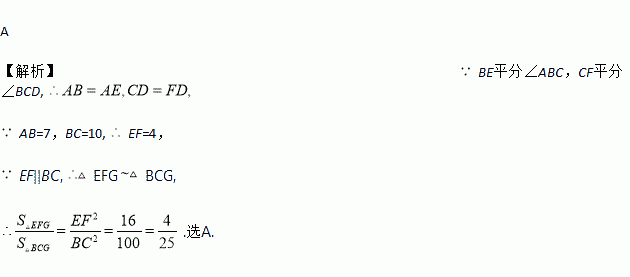 如图,在□ABCD中,BE平分∠ABC,CF平分∠BCD,E、F在AD上,BE与CF相交于点G,若AB=7,BC=10,则△EFG与△BCG的面积之比为( )