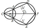 分析:可通过证三角形CDF和CEF来求解.已知的条件只有一条公共边,那么我们可连接AB,作O2M⊥AD,O2N⊥BE,则CF就垂直平分AB,因此∠DAB=∠ECF,那么根据角平分线上的点到角两边的距离相等可得出AD弦和BE弦的弦心距就相等,因此AD=BE,则CD=CE至此三角形全等的所有条件就都证出来了.