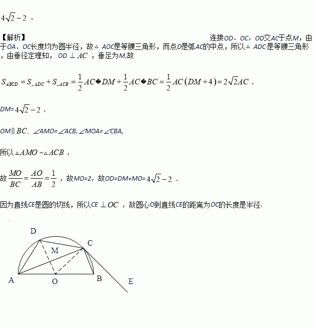 如图,AB为半圆O的直径,直线CE与半圆O相切于点C,点D是的中点,CB=4,四边形ABCD的面积为AC,则圆心O到直线CE的距离是_____.