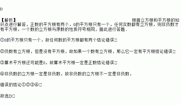 下列命题:①任何数的平方根有两个;②如果一个数有立方根,那么它一定有平方根;③算术平方根一定是正数;④非负数的立方根不一定是非负数.错误的个数为( )