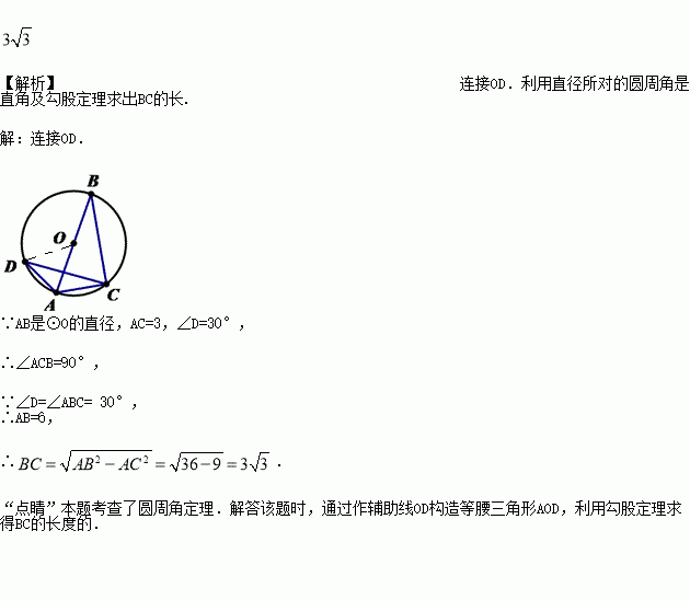 如图,AB是⊙O的直径,且弦AC=3,圆周角∠D=30°,则弦BC的长为______.