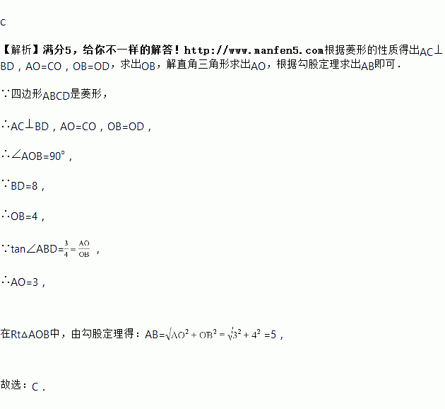 如图,在菱形ABCD中,对角线AC、BD相交于点O,BD=8,tan∠ABD=,则线段AB的长为( )