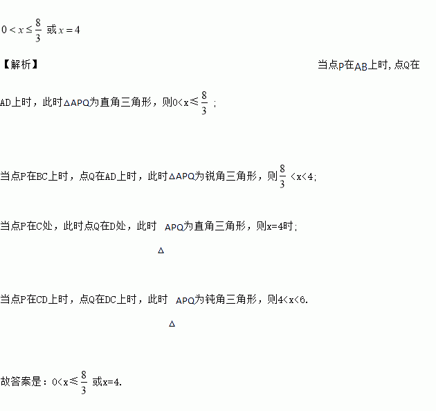 如图,长方形ABCD中,AB=8,AD=4.点Q与点P同时从点A出发,点Q以每秒1个单位的速度沿A→D→C→B的方向运动,点P以每秒3个单位的速度沿A→B→C→D的方向运动,当P,Q两点相遇时,它们同时停止运动.设Q点运动的时间为x(秒),在整个运动过程中,当△APQ为直角三角形时,则相应的x的值或取值范围是_______________.