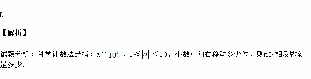 D 【解析】 试题分析:科学计数法是指:a×,1≤<10,小数点向右移动多少位,则n的相反数就是多少.