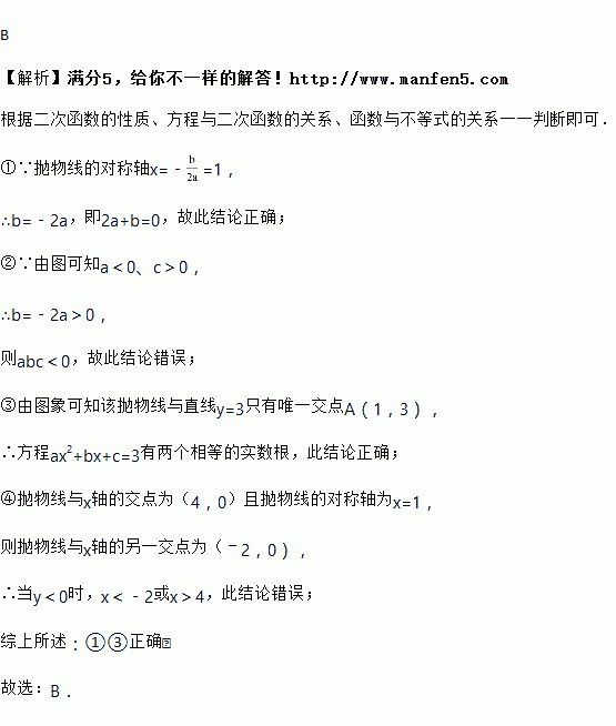 如图是抛物线y=ax2+bx+c(a≠0)图象的一部分,抛物线的顶点坐标A(1,3),与x轴的一个交点B(4,0),有下列结论:①2a+b=0,②abc>0;③方程ax2+bx+c=3有两个相等的实数根,④当y<0时,﹣2<x<4,其中正确的是( )