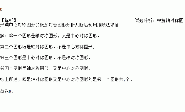 B 【解析】试题分析:根据轴对称图形与中心对称图形的概念对各图形分析判断后利用排除法求解. 【解析】 第一个图形是轴对称图形,又是中心对称图形, 第二个图形既是轴对称图形,不是中心对称图形, 第三个图形是中心对称图形,不是轴对称图形, 第四个图形是轴对称图形,又是中心对称图形, 综上所述,既是轴对称图形又是中心对称图形的是第二个图形共2个. 故选B. ...