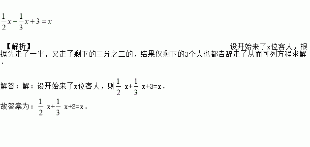 【解析】设开始来了x位客人,根据先走了一半,又走了剩下的三分之二的,结果仅剩下的3个人也都告辞走了从而可列方程求解. 解答:【解析】 设开始来了x位客人,则x+x+3=x. 故答案为:x+x+3=x.