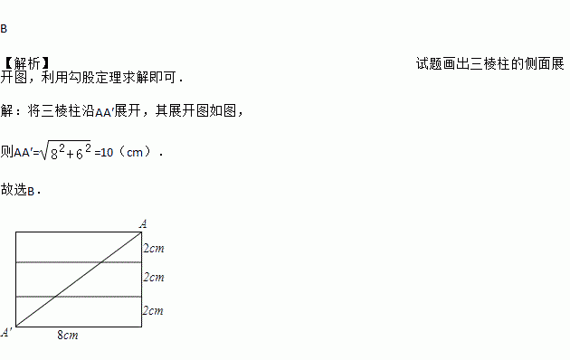 2015年是国际“光”年,某校“光学节”纪念品是一个底面为等边三角形的三棱镜(如图).三棱镜的三个侧面上,从顶点A到顶点A,镶有一圈金属丝,已知此三棱镜的高为8cm,底面边为2cm,则这圈金属丝的长度至少为( )