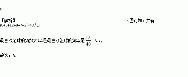 最喜欢的体育项目是什么?”的问题进行了调查,每位同学都选择了其中的一项,现把所得的数据绘制成频数分布直方图(如下图),据图中的信息可知,该班学生最喜欢足球的频率是( )![]()