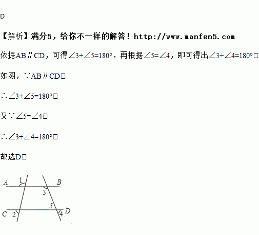 A. ∠1=∠2 B. ∠3=∠4 C. ∠1+∠3=180° D. ∠3+∠4=180°