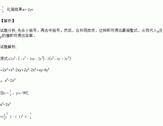 先化简,再求值:2x2–[3(–x2+xy)–2y2]–2(x2–xy+2y2),其中x =,y =–1.