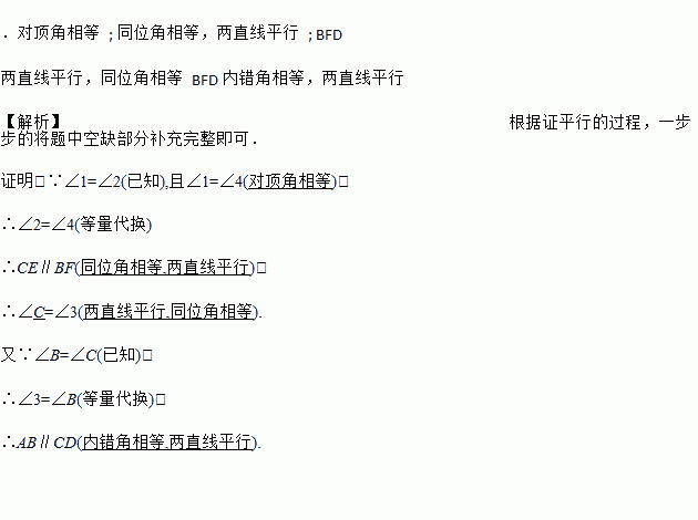 如图,已知∠1 =∠2,∠B =∠C,可推得AB∥CD.理由如下: