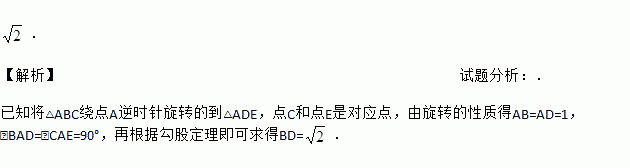 如图,将△ABC绕点A逆时针旋转的到△ADE,点C和点E是对应点,若∠CAE=90°,AB=1,则BD=_________.