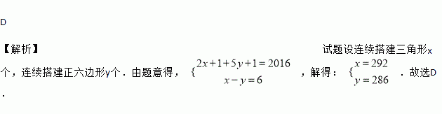 如图,分别用火柴棍连续搭建正三角形和正六边形,公共边只用一根火柴棍.如果搭建正三角形和正六边形共用了2016根火柴棍,并且正三角形的个数比正六边形的个数多6个,那么能连续搭建正三角形的个数是( )