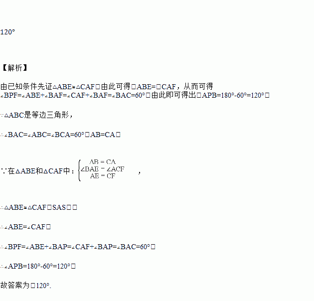 等边三角形ABC的边长为6,在AC,BC边上各取一点E、F,连接AF,BE相交于点P,若AE=CF,则∠APB=______.