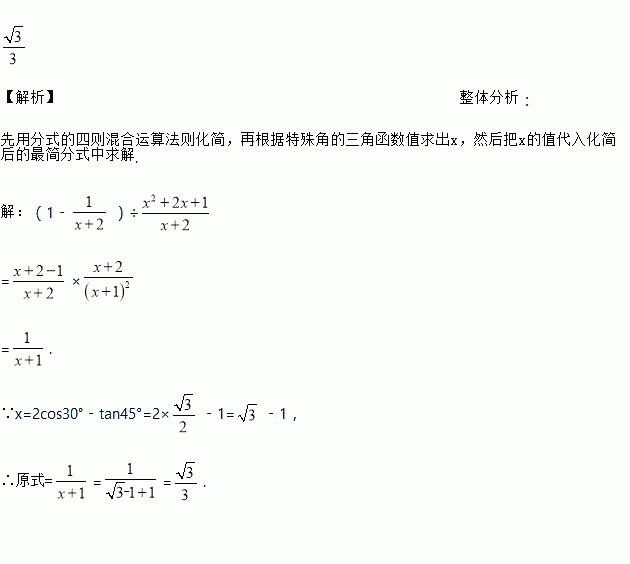 先化简,再求代数式(1﹣)÷的值,其中x=2cos30°﹣tan45°.