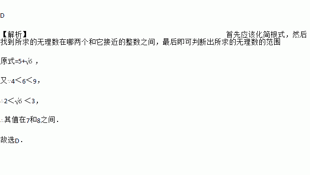 A. 在4和5之间 B. 在5和6之间 C. 在6和7之间 D. 在7和8之间