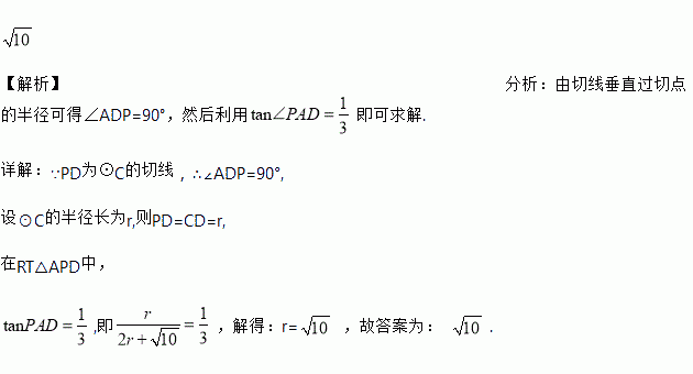 已知DB是⊙C的直径,延长DB到点A,使得,PD为⊙C的切线,PD=CD,连接AP,若,则⊙C的半径长为______.