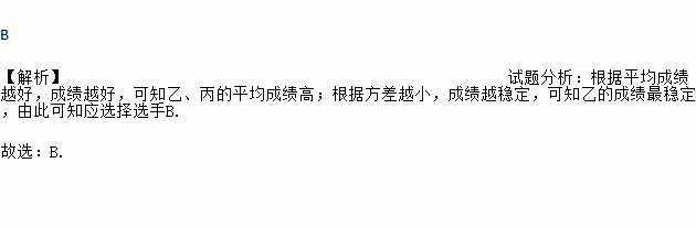 B 【解析】试题分析:根据平均成绩越好,成绩越好,可知乙、丙的平均成绩高;根据方差越小,成绩越稳定,可知乙的成绩最稳定,由此可知应选择选手B. 故选:B.