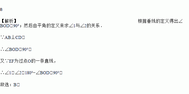 如图,已知AB⊥CD,垂足为O,直线EF经过点O,图中∠1与∠2的关系是( )