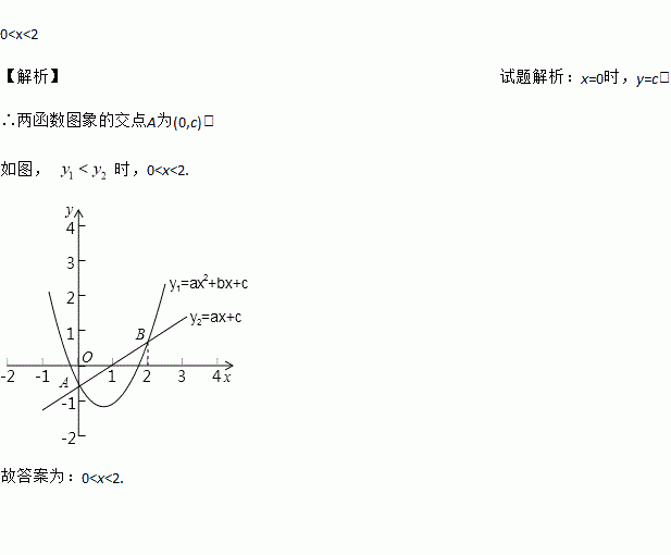 在平面直角坐标系中,二次函数y1=ax2+bx+c(a>0)与一次函数y2=ax+c 的图像交于A、B两点,已知B点的横坐标为2,当y1<y2时,自变量x的取值范围是____.