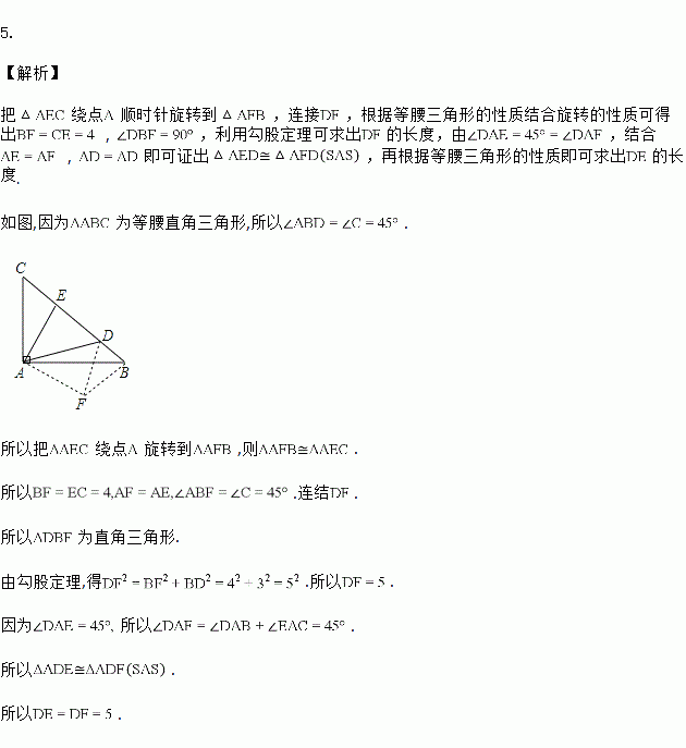 如图所示,在Rt△ABC中,∠BAC=90°,AC=AB,∠DAE=45°,且BD=3,CE=4 ,求DE的长.