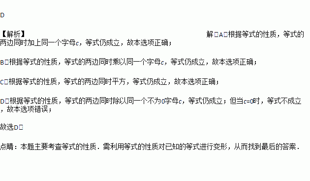 A. a+c=b+c B. ac=bc C. a2=b2 D.