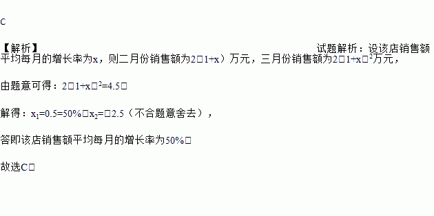某商店今年1月份的销售额是2万元,3月份的销售额是4.5万元,从1月份到3月份,该店销售额平均每月的增长率是( )