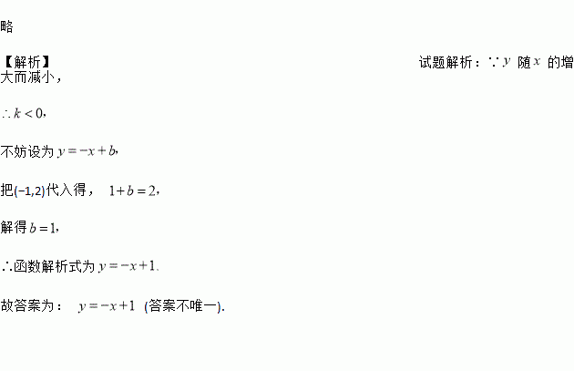 略 【解析】试题解析:∵随的增大而减小, 不妨设为 把(?1,2)代入得, 解得 ∴函数解析式为 故答案为: (答案不唯一).