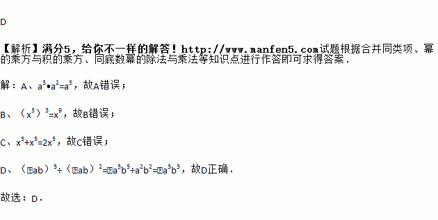 C. x5+x5=x10 D. (-ab)5÷(-ab)2=-a3b3