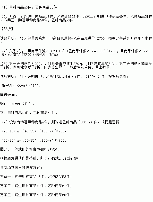 £¨1£©Èô¸ÃÉ̳¡Í¬Ê±¹º½ø¼×¡¢ÒÒÁ½ÖÖÉÌÆ·¹²100¼þÇ¡ºÃÓÃÈ¥2700Ôª£¬ÇóÄܹº½ø¼×¡¢ÒÒÁ½ÖÖÉÌÆ·¸÷¶àÉÙ¼þ£¿