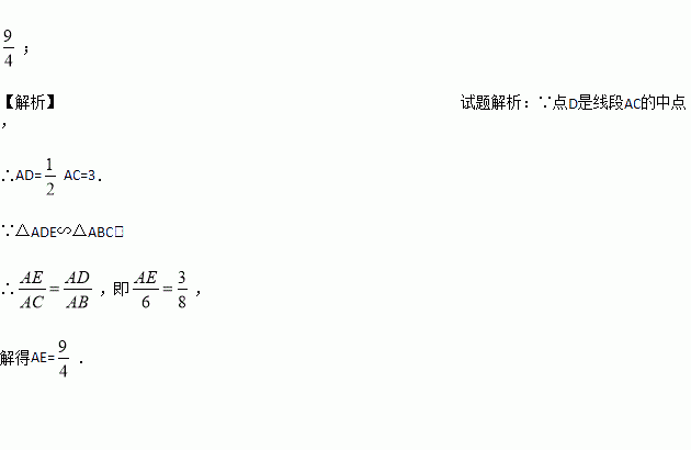 如图,已知中, =8, =6,点是线段的中点,点在线段上,且∽,则 = _________;