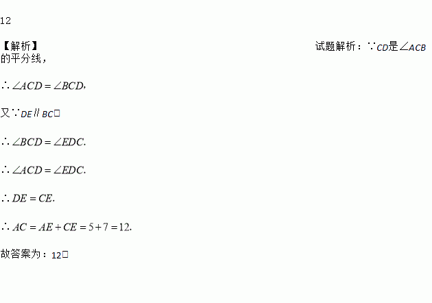 如图所示,在△ABC中,CD是∠ACB的平分线,DE∥BC交AC于E,若DE=7cm,AE=5cm,则AC=_____cm.