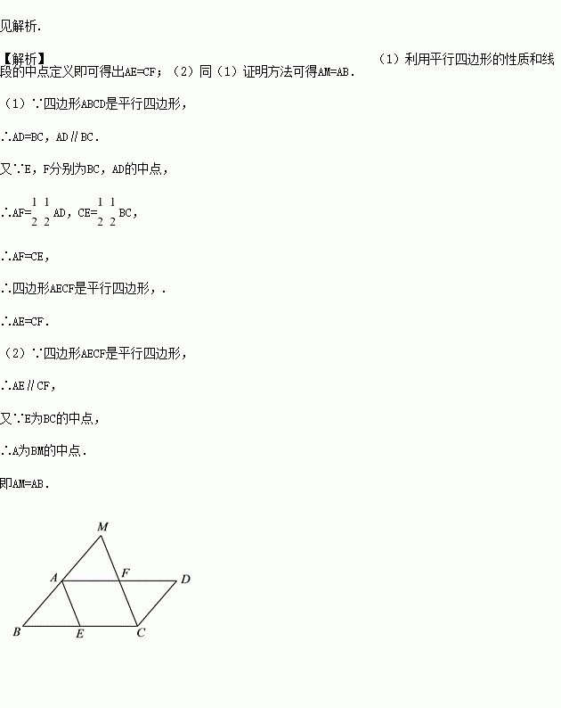 如图,四边形ABCD是平行四边形,E,F分别为BC,AD的中点,