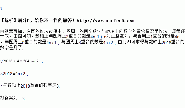 如图所示,数轴被折成90°,圆的周长为4个单位长度,在圆的4等分点处标上数字0,1,2,3,先让圆周上数字2所对应的点与数轴上的数3所对应的点重合,数轴固定,圆紧贴数轴沿着数轴的正方向滚动,那么数轴上的数2018将与圆周上的数字________重合.