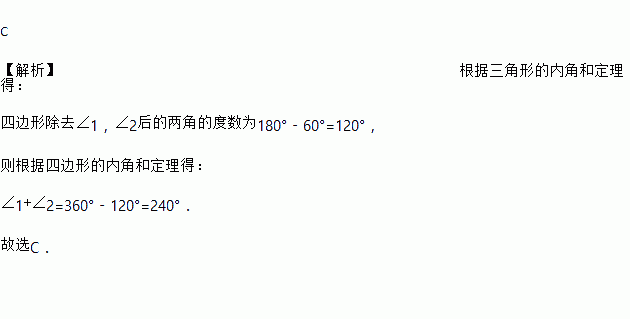 C 【解析】根据三角形的内角和定理得: 四边形除去∠1,∠2后的两角的度数为180°﹣60°=120°, 则根据四边形的内角和定理得: ∠1+∠2=360°﹣120°=240°. 故选C.