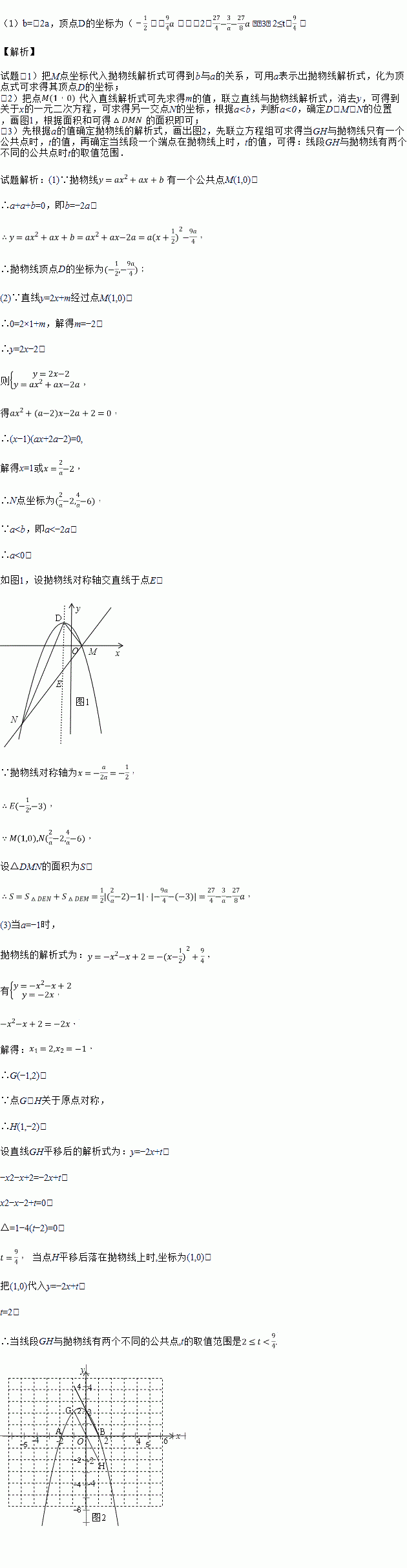 已知,抛物线y=ax2+ax+b(a≠0)与直线y=2x+m有一个公共点M(1,0),且a<b.
