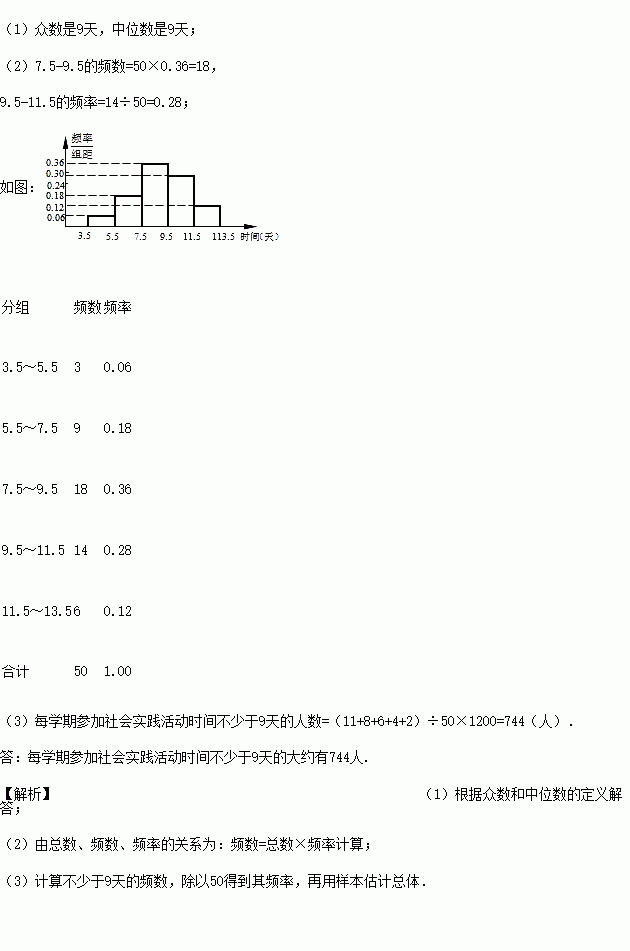 (3)请你估算这所学校该年级的学生中,每学期参加社会实践活动时间不少于9天的大约有多少人?