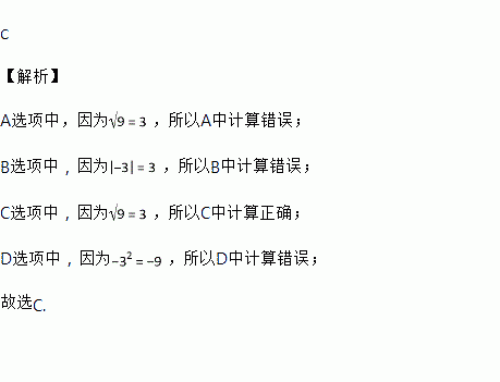 A. =±3 B. |﹣3|=﹣3 C. =3 D. ﹣32=9