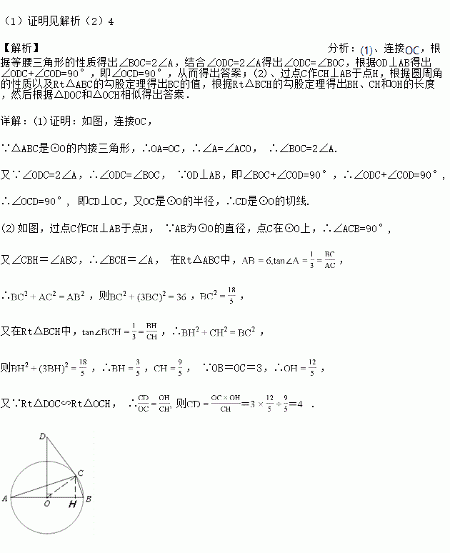 如图,已知△ABC是⊙O的内接三角形,AB为⊙O的直径,OD⊥AB于点O,且∠ODC=2∠A.