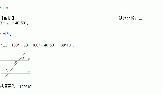 查看答案如图,已知直线a∥b,若∠1=40°50′,则∠2的度数为________.