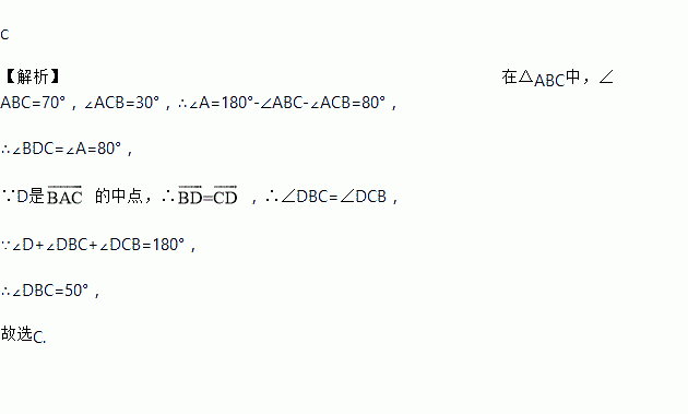 C 【解析】在△ABC中,∠ABC=70°,∠ACB=30°,∴∠A=180°-∠ABC-∠ACB=80°, ∴∠BDC=∠A=80°, ∵D是 的中点,∴,∴∠DBC=∠DCB, ∵∠D+∠DBC+∠DCB=180°, ∴∠DBC=50°, 故选C.