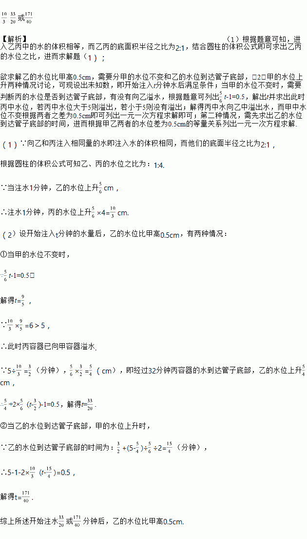 实验室里,水平桌面上有甲、乙、丙三个圆柱形容器(容器足够高),底面半径之比为1∶2∶1,用两个相同的管子在容器的5 cm高度处连通(即管子底离容器底5 cm),现三个容器中,只有甲中有水,水位高1 cm,如图所示.若每分钟同时向乙和丙注入相同量的水,开始注水1分钟,乙的水位上升