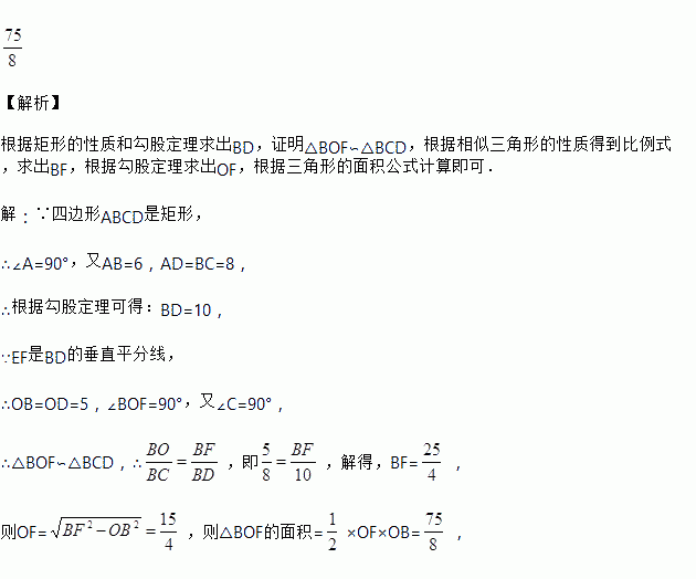 如图,矩形ABCD中,已知AB=6,BC=8,BD的垂直平分线交AD于点E,交BC于点F,则△BOF的面积为 .
