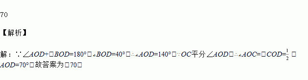 如图所示,点O是直线AB上的点,OC平分∠AOD,∠BOD=40°,则∠AOC=________ °.