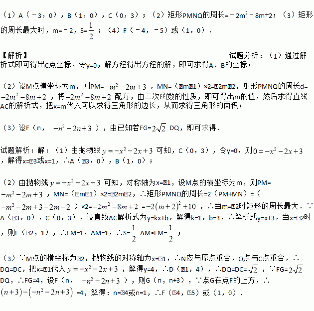 (2)点M(m,0)为线段AB上一点(点M不与点A、B重合),过点M作x轴的垂线,与直线AC交于点E,与抛物线交于点P,过点P作PQ∥AB交抛物线于点Q,过点Q作QN⊥x轴于点N,可得矩形PQNM.如图,点P在点Q左边,试用含m的式子表示矩形PQNM的周长;